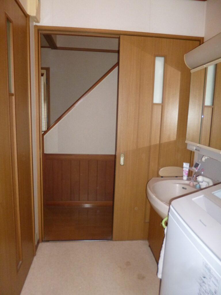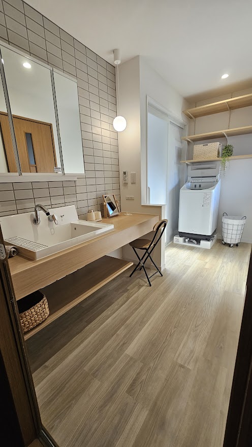・並んでいた洗面+洗濯機を分離。広いカウンターの洗面化粧台にして座ってメイク出来るスペースも作成