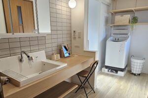 ・並んでいた洗面+洗濯機を分離。広いカウンターの洗面化粧台にして座ってメイク出来るスペースも作成