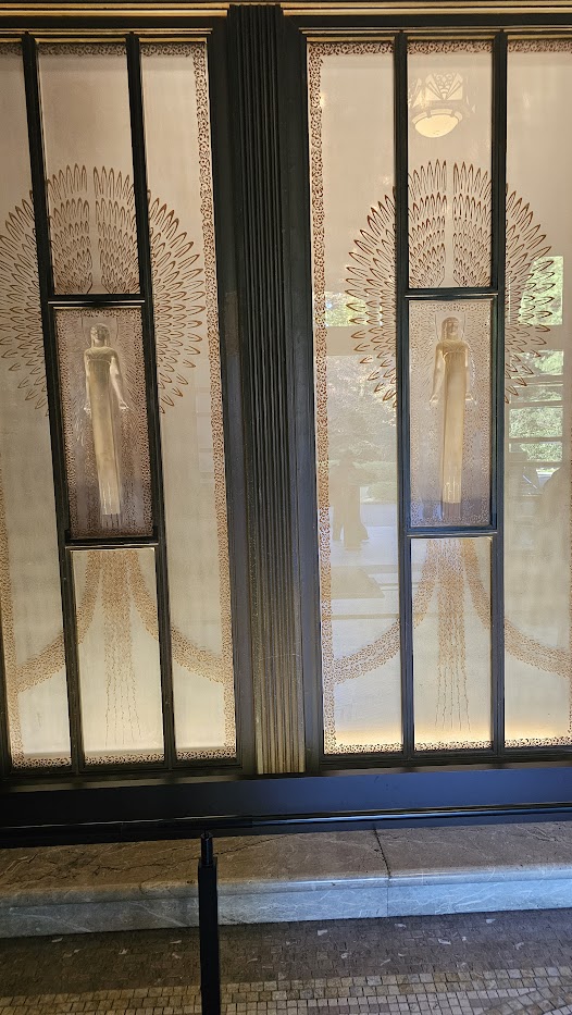 玄関では、フランスの巨匠 ルネ・ラリックが手がけた《ガラスレリーフ扉》が迎えてくれます。