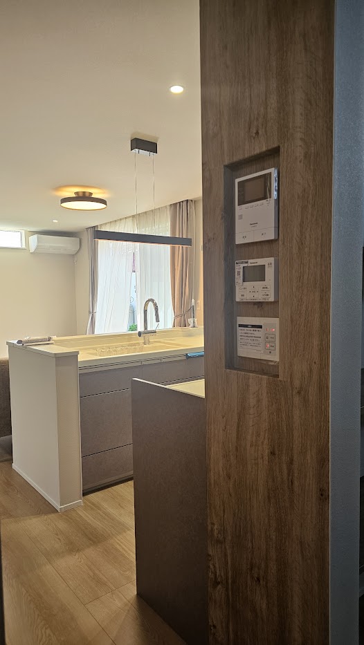 自然とキッチン背面の木目クロスへと視線が抜けていきます。