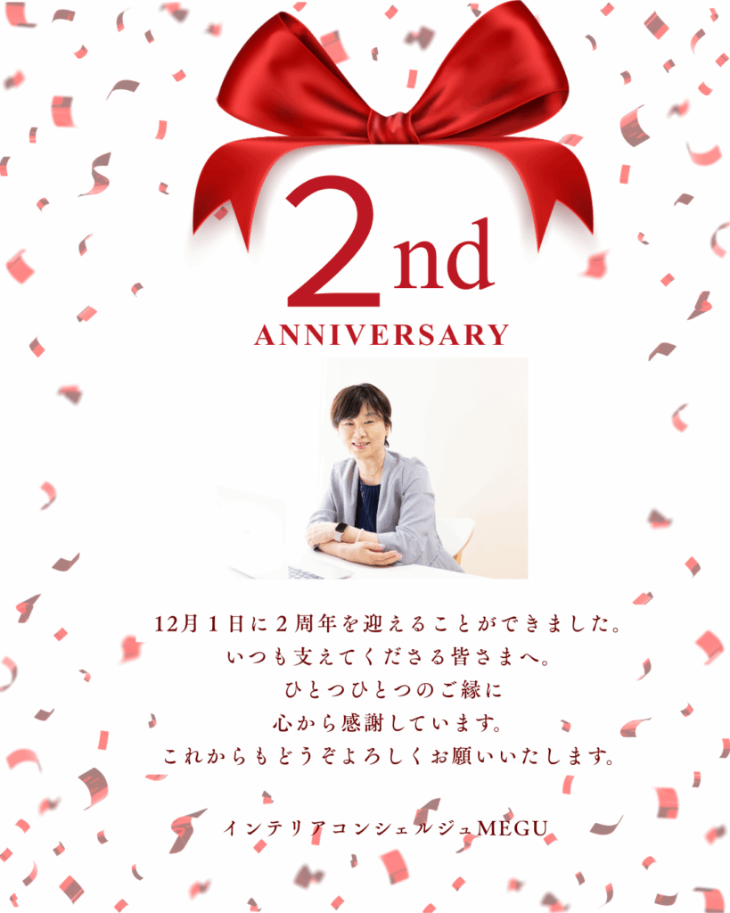 この度、インテリアコンシェルジュMEGUは皆さまに支えていただきながら 3年目の歩みへと進むことができました。 起業してからの2年間、リフォームや新築のコーディネート、ホームステージング、ワークショップ開催、セミナー講師視察や学びの機会まで、... -